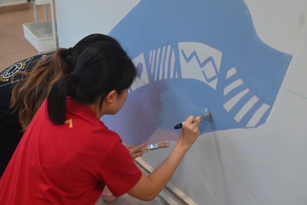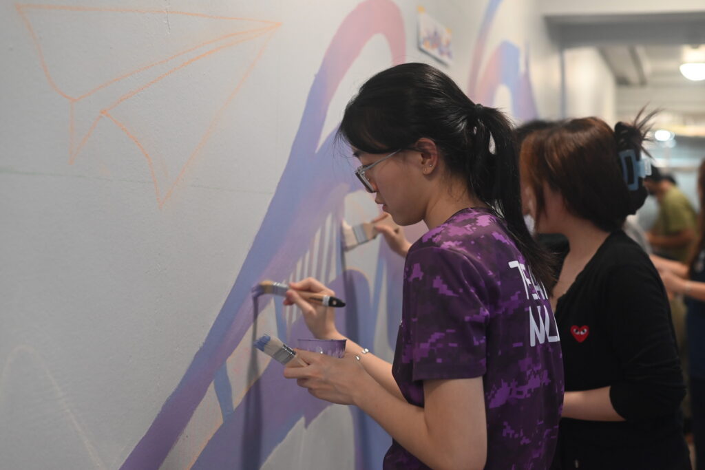 This is the 4th series of this activity being held, and each time, it never fails to fascinate passersby who see art coming to life! This time, the concept of the Wall Mural painting encompasses the idea of ‘Chasing your dreams’. The colour theme for this art piece is pastel which includes pink, purple and blue.